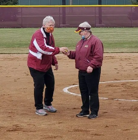 Former Otter softball coaches Carolyn Schmidt and Renee Erickson threw out the honorary first pitch