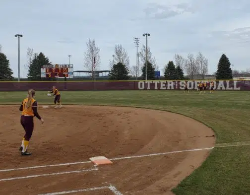 Former Otter softball coaches Carolyn Schmidt and Renee Erickson threw out the honorary first pitch. The Otters swept St Cloud Apollo in the double header.