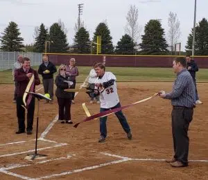 Mayor Ben Schierer did the honor of cutting the ribbon Tuesday afternoon, as the Otters dedicated a new fast-pitch softball field at Delagoon Park Field 5. Fergus Falls Otters Activities Director Derek Abrahams, talked about the need for the renovated field;