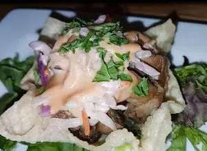 Dave and I had to try their Chislic steak bites with bleu cheese sauce, the light and flaky Halibut fish fingers garnished with lemons and a homemade tarter sauce, we had the pleasure as well of tasting a bit more exotic flavors with their prime rib won-tons topped with sauce and mixture of perfectly paired thinly sliced veg.