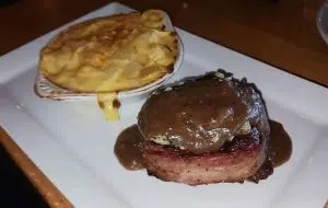 A perfectly seared Filet Mignon wrapped in bacon and and savory reduction with cheesy Au gratin potatoes.
