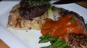 It was pan seared Grouper(Fish) with tomato based cream sauce, on a bed of sauerkraut loaded mashed potatoes, a petite steak served medium rare, with chimichurri, and green beans.