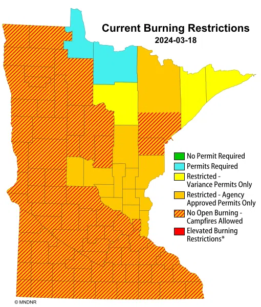 (St. Paul, MN) — Spring burning restrictions go into effect today (March 18th) for more than three dozen counties in parts of western, central and northern Minnesota.