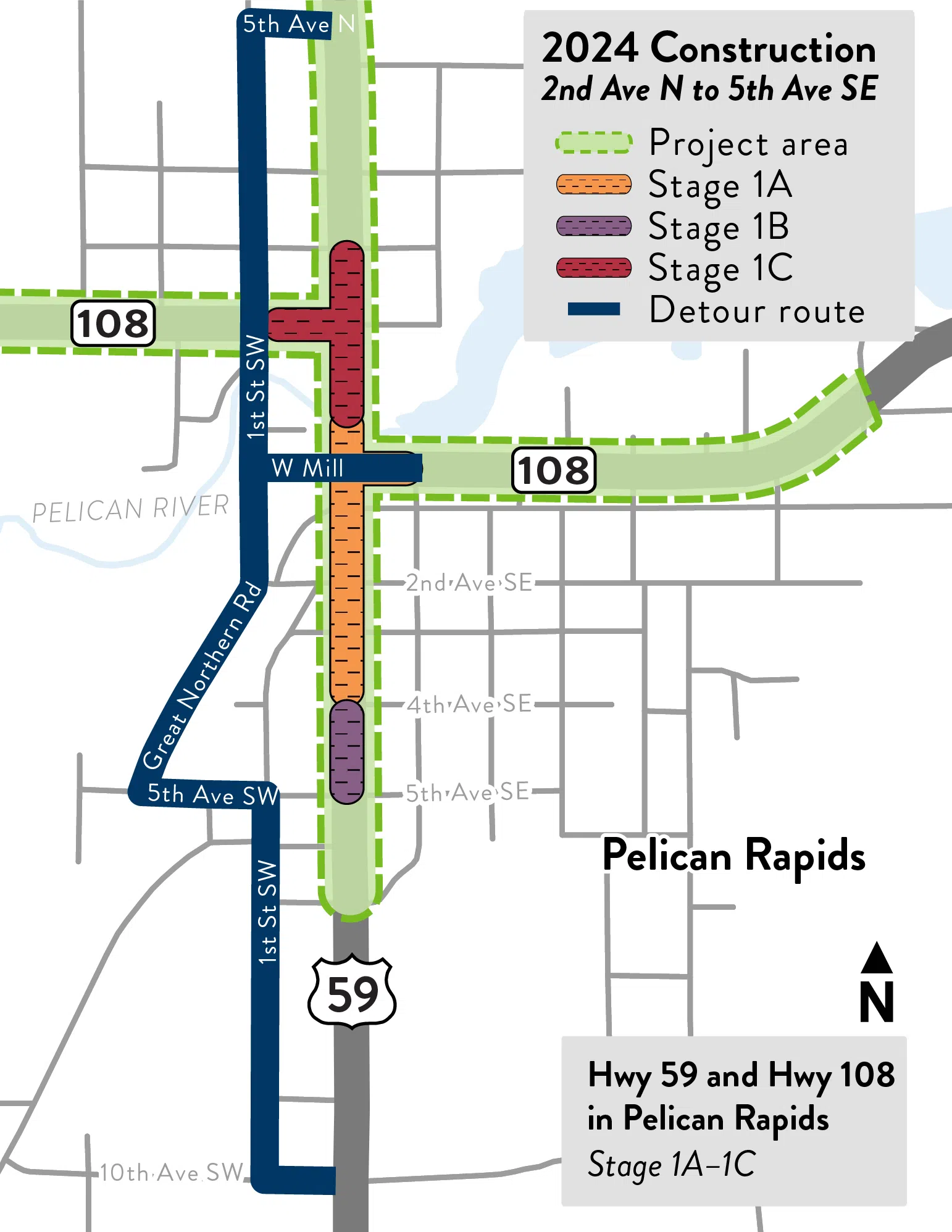 Pelican Rapids, MN – On Tuesday, June 25th, weather permitting, the intersection of Highway 59 and Highway 108 west will close as construction progresses into Stage 1C in Pelican Rapids, according to the Minnesota Department of Transportation.
