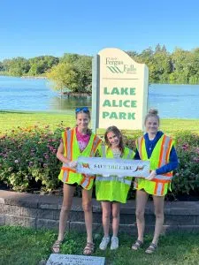 Fergus Falls, MN – Before kicking off the new school year, students painted a white stencil of otters with an important “Save the Lake” message near storm drain inlets. Bella Harrington, Caitlin Yavarow and Maggie Proudfoot did the project on August 30th as part of the City of Fergus Falls work to reduce water pollution and bring awareness to residents that what is dumped into a storm drain pollutes our water sources.