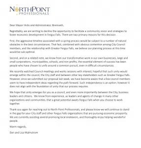 Fergus Falls, MN – North Point Professionals, an executive services firm out of Battle Lake, rescinded their proposal to assist the Fergus Falls City Council in its work on economic development.