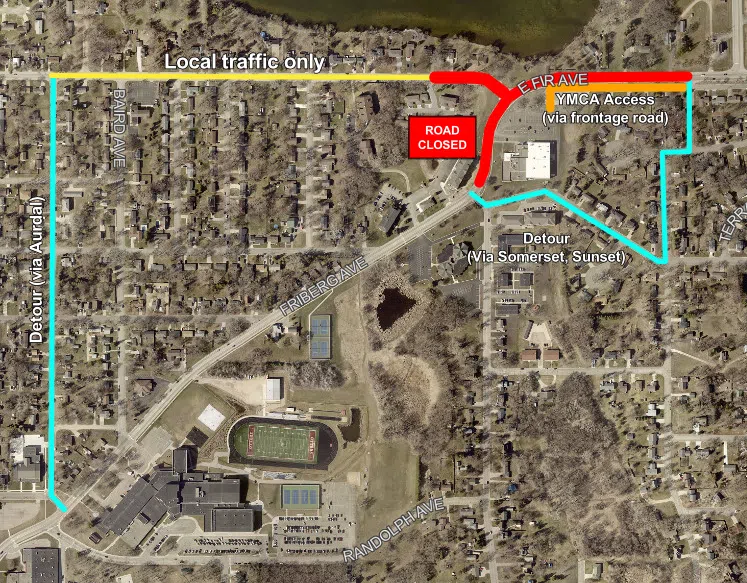 Traffic along Fir Avenue between Aurdal and Friberg is local traffic only. A detour along Aurdal has been established for through traffic.