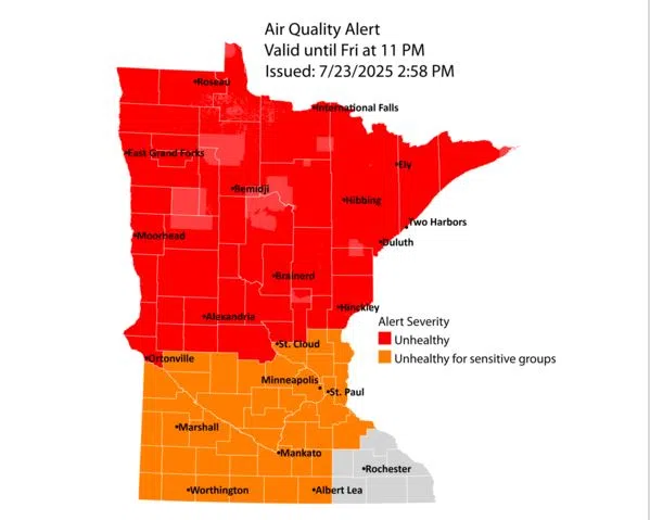 The Minnesota Pollution Control Agency (MPCA) has expanded the current air quality alert to include northern, central, south central, and southwest Minnesota. The alert runs until 11 p.m. on Friday, July 25. The affected area includes the Twin Cities metro area, Brainerd, Alexandria, Albert Lea, Marshall, Worthington, Hinckley, St. Cloud, Ortonville, Mankato, Bemidji, East Grand Forks, Moorhead, International Falls, Two Harbors, Hibbing, Ely, Duluth, Roseau, and the Tribal Nations of Upper Sioux, Mille Lacs, Prairie Island, Leech Lake, White Earth, Red Lake, Grand Portage, and Fond du Lac.