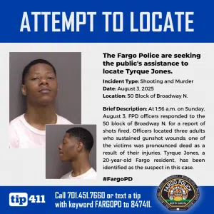 Police say they are seeking the public’s help in locating Tyrque Jones, a 20-year-old Fargo resident, for a shooting incident on Broadway that killed 19-year-old Azeem Holmes, as well as leaving one in critical condition, and one with non-life-threatening injuries. Officers were called to the scene at around 1:56 a.m. for a report of shots fired.