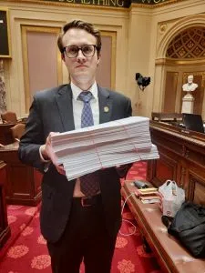 Senator Rasmusson holding a copy of the omnibus bill that was introduced on the last day of the legislative session. (Senator Rasmusson’s Office)